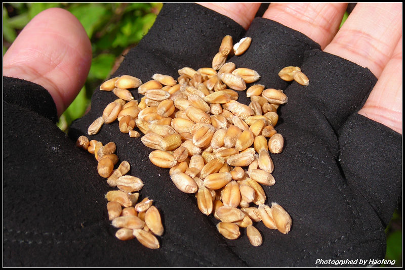 第一次捧著新鮮剛採收的麥子,我們覺得很新鮮,聽老伯的話,我們也嚐了幾顆生鮮麥子,咬起來有點硬,但是有淡淡的麥香,非常特別。